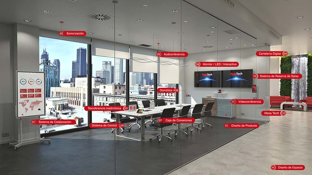 En HubTech diseñamos e instalamos equipamiento audiovisual para salas de reuniones que mejora la comunicación, la productividad y la experiencia de los participantes. Integramos pantallas de gran formato, sistemas de sonido profesional, videoconferencia y control centralizado para crear entornos eficientes y adaptados a las necesidades de cada empresa.