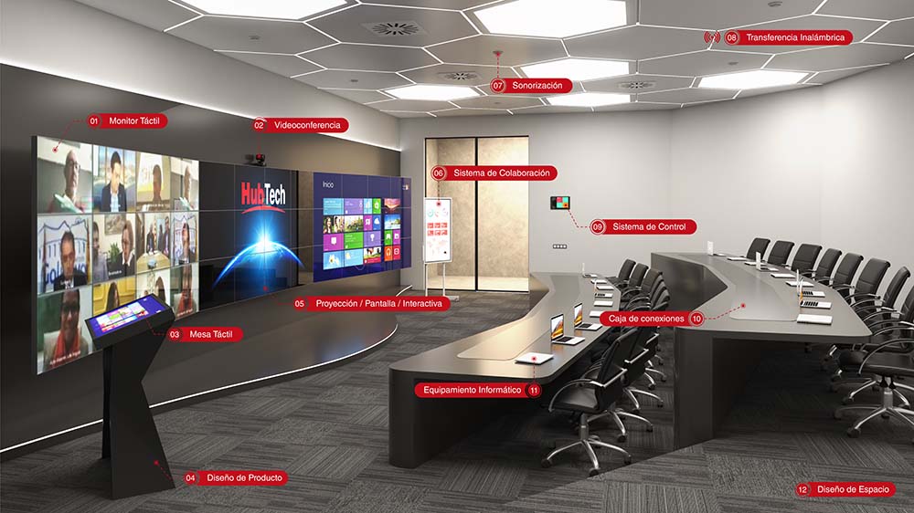 En HubTech creamos soluciones de videoconferencia profesional diseñadas para garantizar una experiencia de colaboración efectiva y productiva. Un buen diseño de espacio de videoconferencia requiere un enfoque integral que tenga en cuenta factores como la iluminación, la acústica, el diseño del mobiliario, las pantallas, los dispositivos de audio y vídeo, y la conectividad de red.